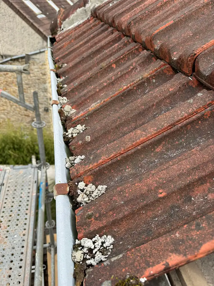 La gouttière existante présentait des signes d’usure avancée : déformations, fuites et oxydation. Ces défauts entraînaient des écoulements incontrôlés le long des murs, favorisant l’humidité et les dégradations.